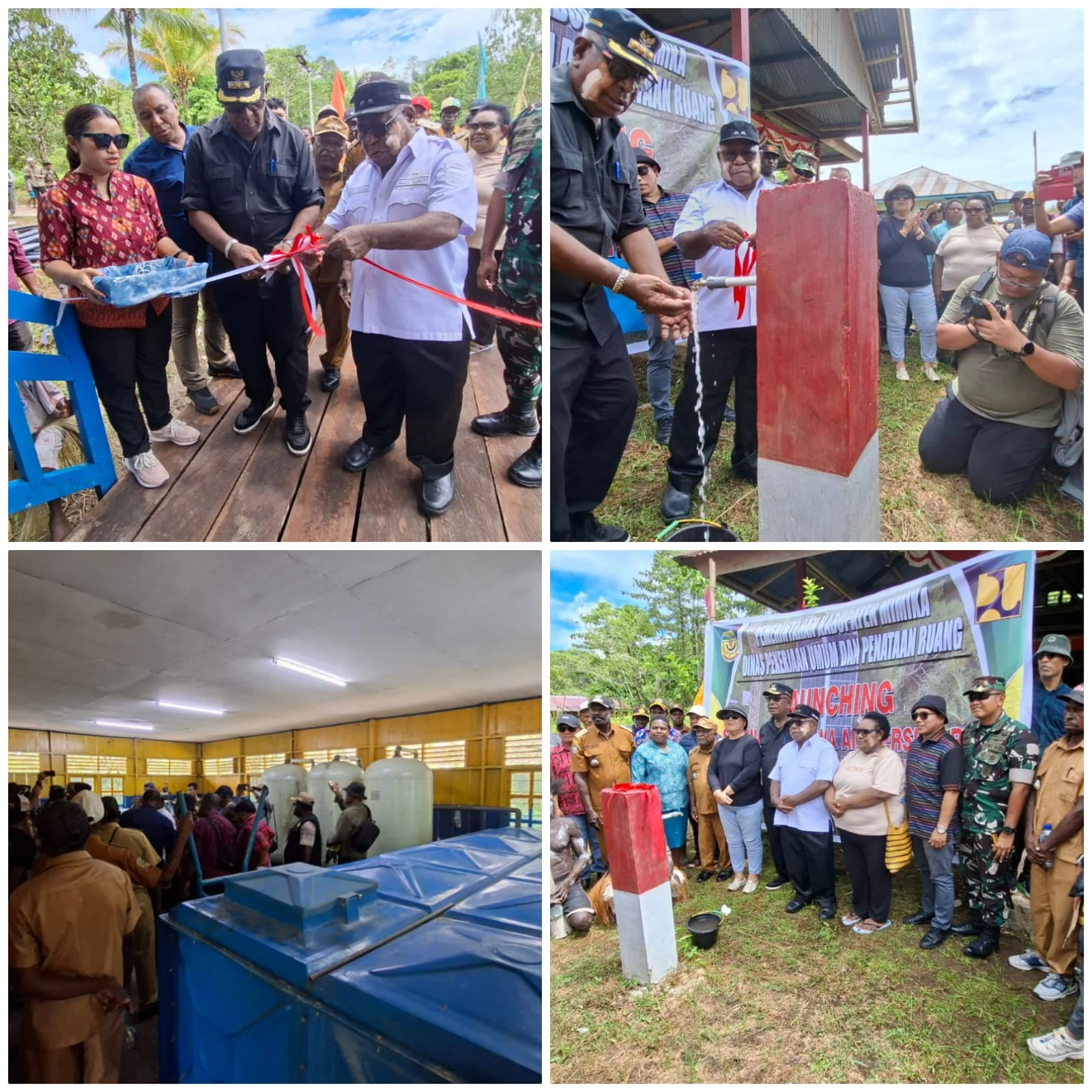 Bupati Mimika Johannes Rettob saat meresmikan air bersih di Mupruka. Dan Wabup Emanuel Kemong saat menggunting pita peresmian depot air minum.