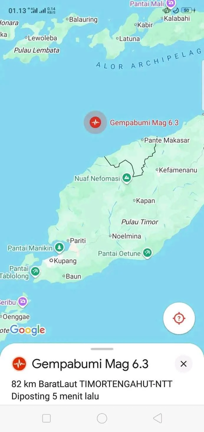 ATAMBUA |LINTASTIMOR.ID)  — Malam di perbatasan itu sejatinya tenang. Angin laut berembus lembut dari arah utara, menggoyang dedaunan lontar dan nyiur di tepian pantai. Namun sekitar pukul 01.04 WITA, bumi Timor tiba-tiba bergetar. Dari langit tak ada kilat, tapi dari dasar laut, energi raksasa bangkit: gempabumi bermagnitudo 6,3 mengguncang 82 kilometer barat laut Kabupaten Timor Tengah Utara, Nusa Tenggara Timur.