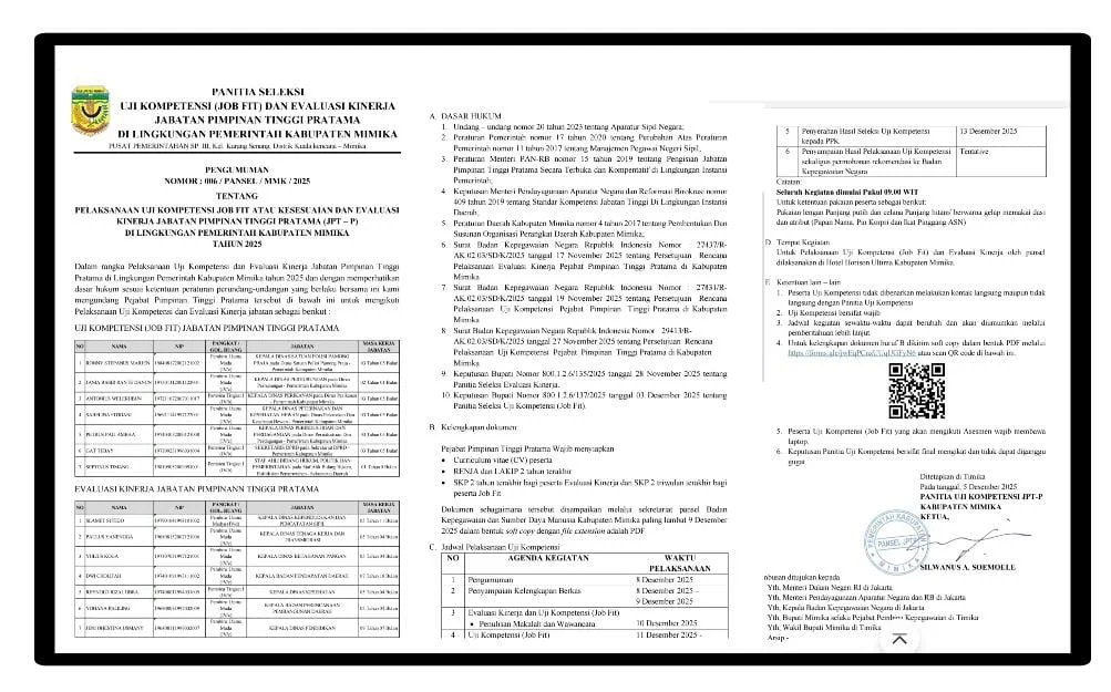 Di Mimika, Desember bukan sekadar penutup kalender. Ia menjelma ruang penilaian, ruang penegasan bahwa jabatan bukan hak milik abadi, melainkan mandat yang setiap saat dapat dipertanyakan ulang. Pemerintah Kabupaten Mimika, melalui Panitia Seleksi, resmi merilis daftar 14 pejabat tinggi pratama yang diwajibkan mengikuti Uji Kompetensi (Job Fit) dan Evaluasi Kinerja Tahun 2025, sebagaimana tertuang dalam surat bernomor 006/PANSEL/MMK/2025 bertanggal 5 Desember 2025.