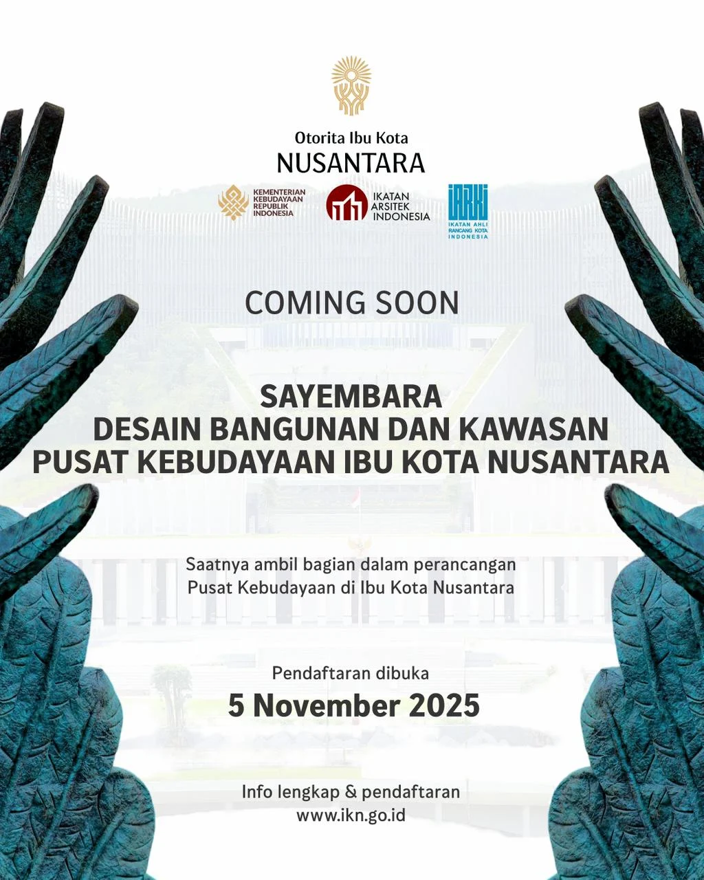 Pendaftaran sayembara ini dibuka mulai 5 November 2025, menjadi panggilan bagi para insan kreatif Tanah Air untuk melahirkan rancangan yang mampu memadukan seni, pengetahuan, dan inovasi—dalam satu ekosistem kebudayaan yang hidup dan berkarakter Indonesia.