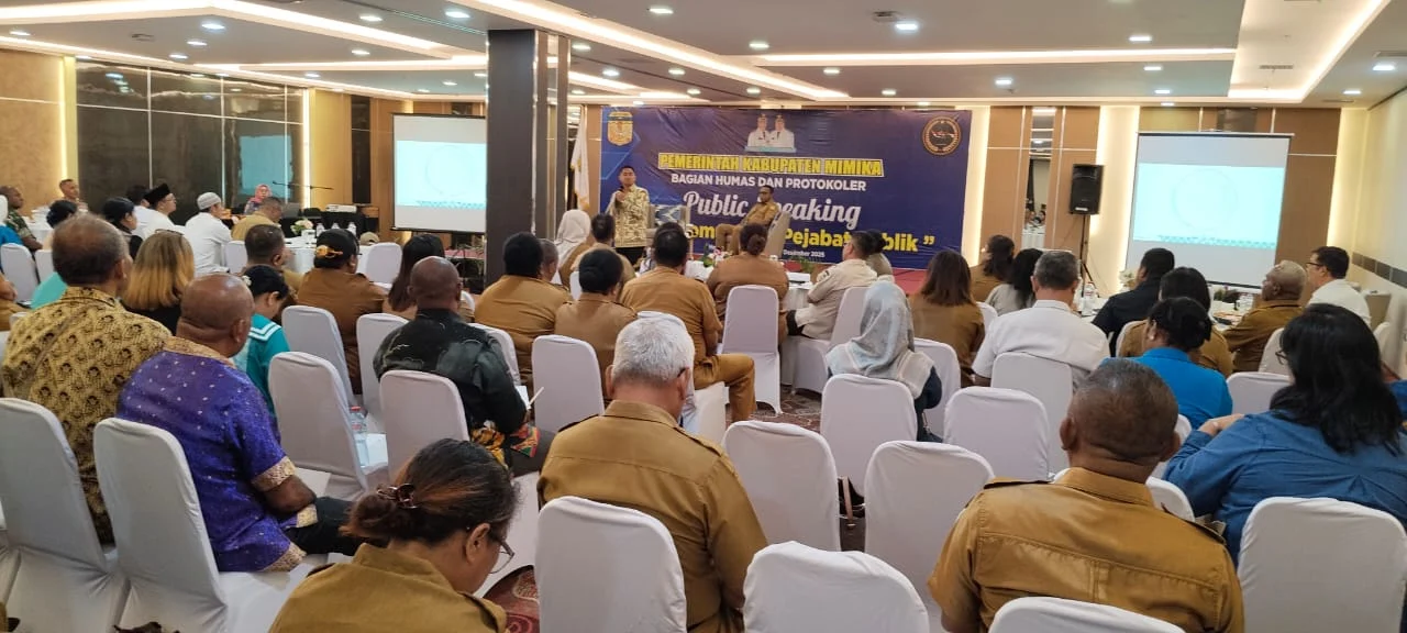TIMIKA |LINTASTIMOR.ID)—Humas dan Protokoler Pemda Mimika meramu dua hari pelatihan public speaking (8–9 Desember) di Hotel Horison Diana Timika. Di ruangan yang tenang, dengan meja berlapis kain putih dan aroma kopi pagi yang mengalun, para pejabat daerah diajak bukan hanya belajar berbicara, tetapi belajar menghormati setiap kata yang keluar dari bibir jabatan.
